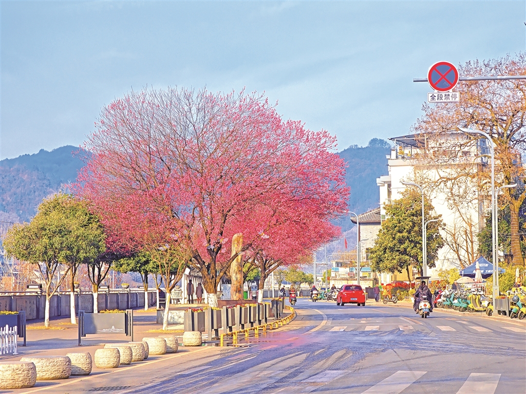 2月12日,石泉县滨江大道梅花绽放,满树繁花迎接新春到来。 杨勇 摄