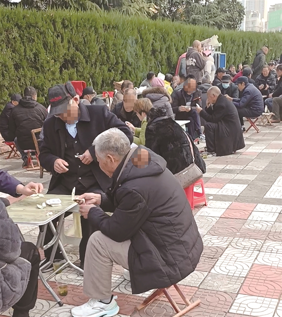⇐近日,在安康城区金州广场旁人行道上,有不少老年人围坐打扑克休闲。值得注意的是,他们不单单是在娱乐,而是有人专门摆桌子从中获利,希望相关部门能加强管理,让公共空间回归休闲属性。