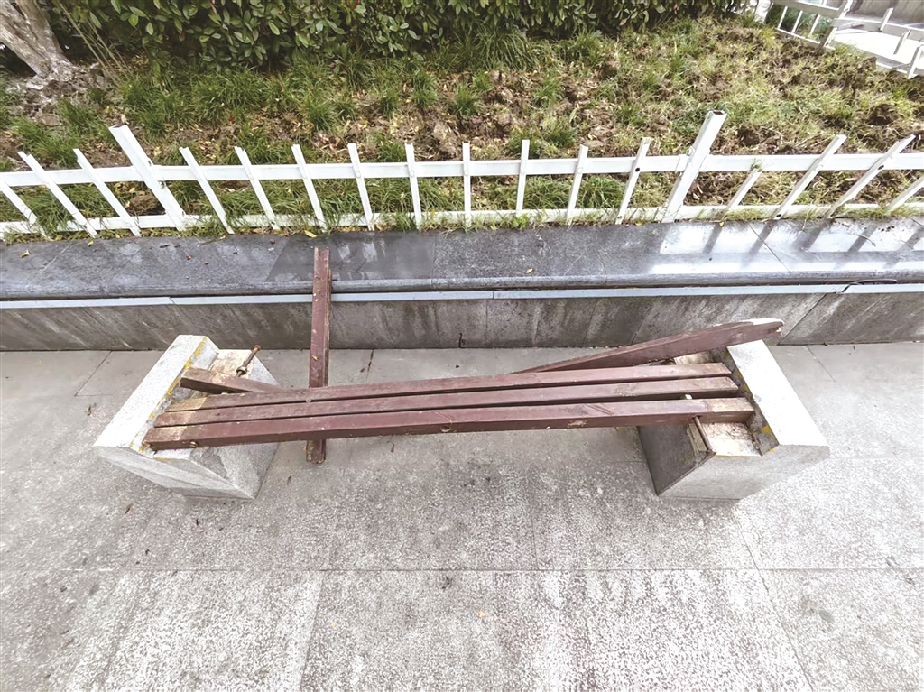 ⇑11月26日,在汉江一桥头小公园内看到,有一张休闲座椅被人为破坏严重,希望广大市民能爱护公物,不要随意破坏。 赖家斌 摄