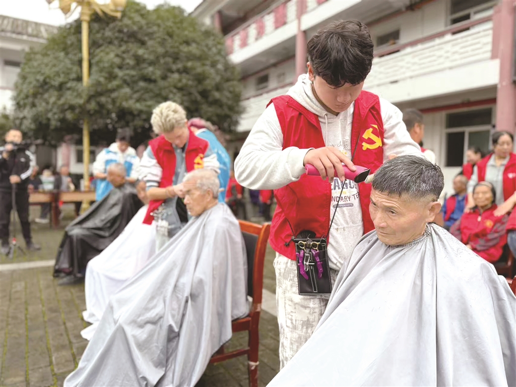 嗡鸣的电推刀,咔嚓作响的剪刀,在理发师手中化作对老人无言的关怀。理发师拂去老人肩上的碎发,也拂去了老人因行动不便而积攒的烦忧。