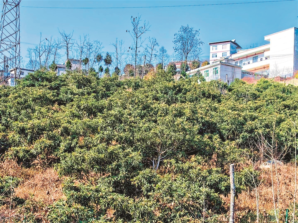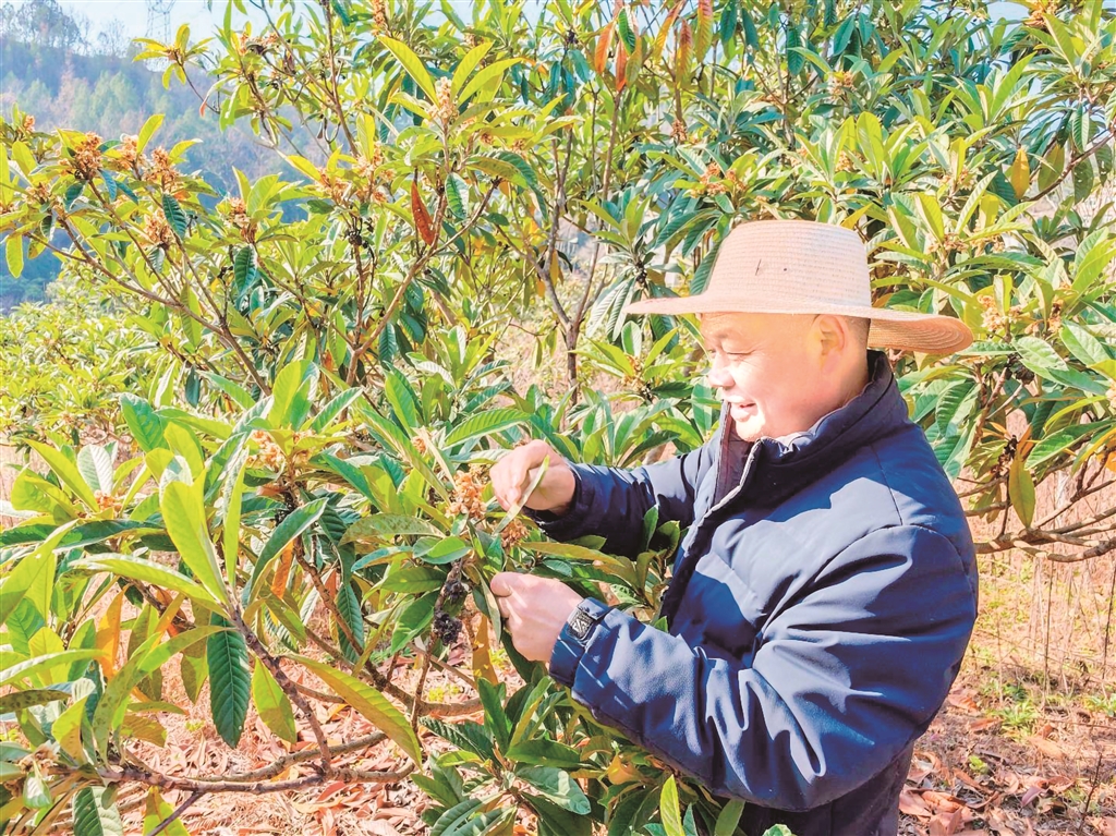 近年来,旬阳市小河镇金坡村通过“企业+集体+农户”模式发展枇杷产业200余亩,带动30余户农户户均增收4万余元。图为12月14日,农户在园区内开展枇杷树修剪与疏花工作,为来年丰收打下基础。