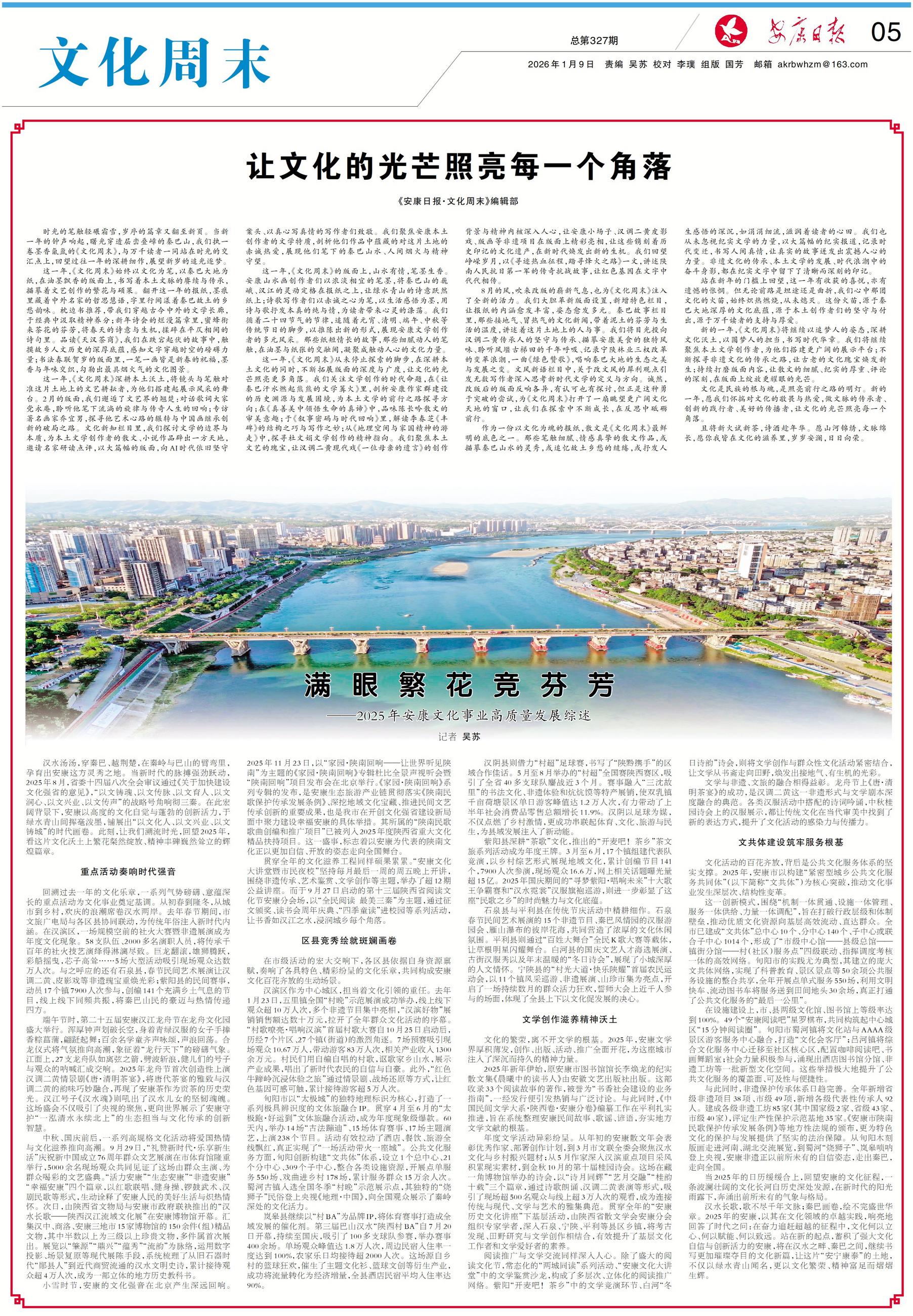这一年,《文化周末》从未停止探索的脚步,在深耕本土文化的同时,不断拓展版面的深度与广度,让文化的光芒照亮更多角落。我们关注文学创作的时代命题,在《让秦巴汗水燃起熊熊的文学篝火》里,剖析安康作家群建设的历史渊源与发展困境,为本土文学的前行之路探寻方向;在《真善美中领悟生命的真谛》中,品味陈长吟散文的审美意趣;于《叙事密码与时代回响》里,解读李春芝《丰碑》的结构之巧与写作之妙;从《地理空间与家国精神的游走》中,探寻杜文娟文学创作的精神指向。我们聚焦本土文艺的瑰宝,让汉调二黄现代戏《一位母亲的遗言》的创作背景与精神内核深入人心,让安康小场子、汉调二黄皮影戏、版画等非遗项目在版面上精彩亮相,让这些镌刻着历史印记的文化遗产,在新时代焕发出新的生机。我们回望峥嵘岁月,以《寻迹热血征程,踏寻烽火之路》一文,讲述陕南人民抗日第一军的传奇抗战故事,让红色基因在文字中代代相传。