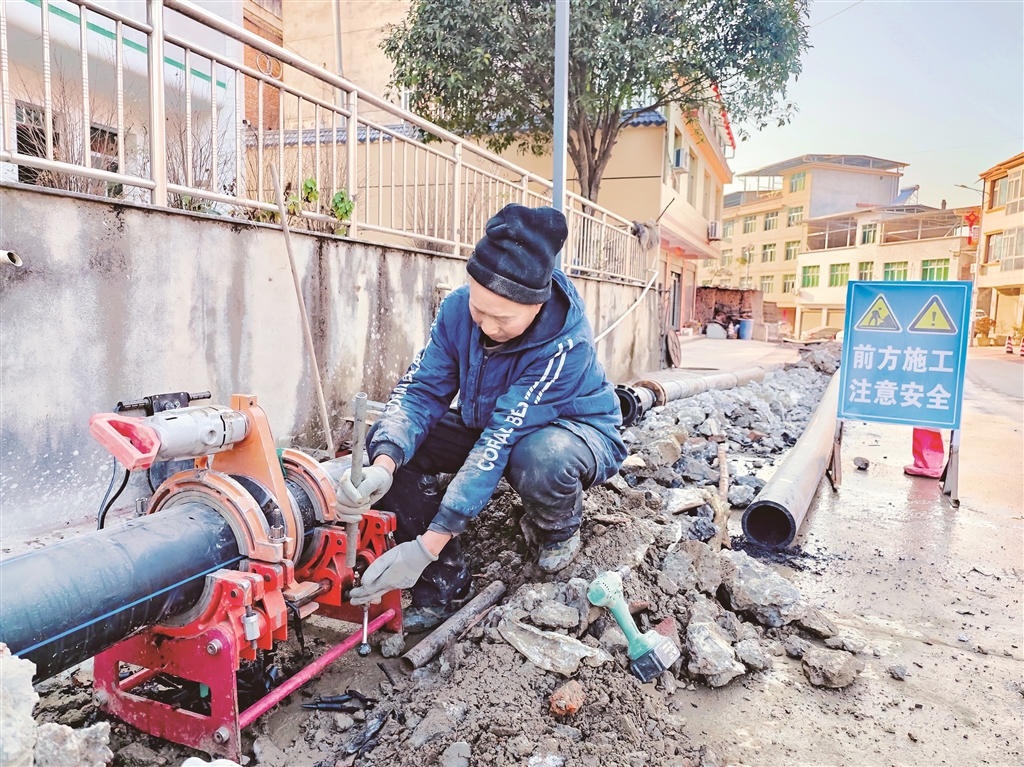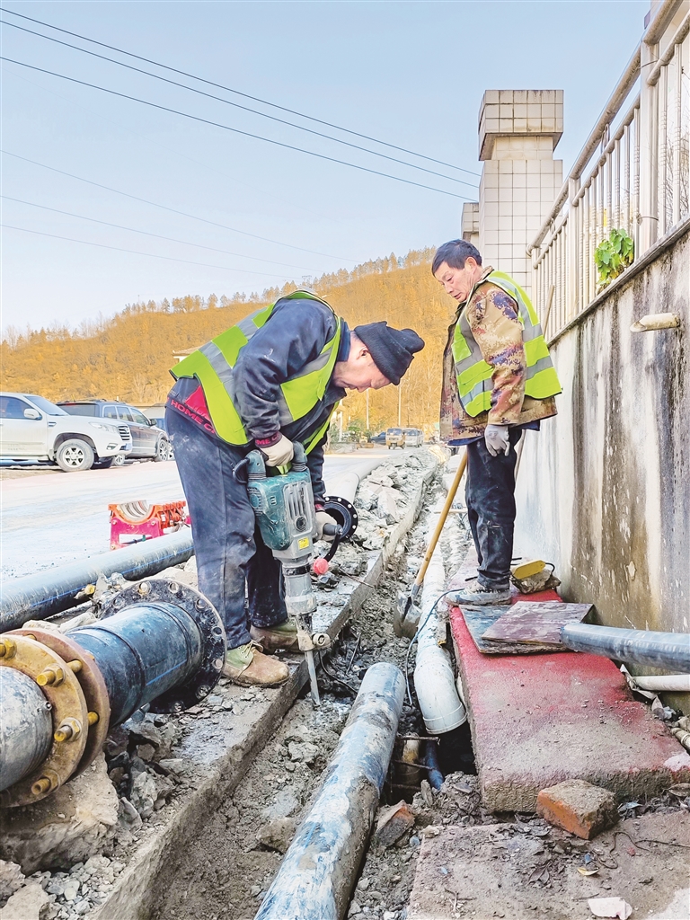 近年来,旬阳市稳步推进城乡供水基础设施建设,通过更换老旧管网、升级改造配套设施等举措,着力补齐供水不足、水压不稳定等饮水保障短板。图为1月11日,在旬阳市蜀河流域城乡供水一体化二期工程(双河镇段)施工现场,工人正在施工。该工程将新建一座200立方米的蓄水池,更换老旧管道3313米,工程完工后将惠及沿线1万余名群众。