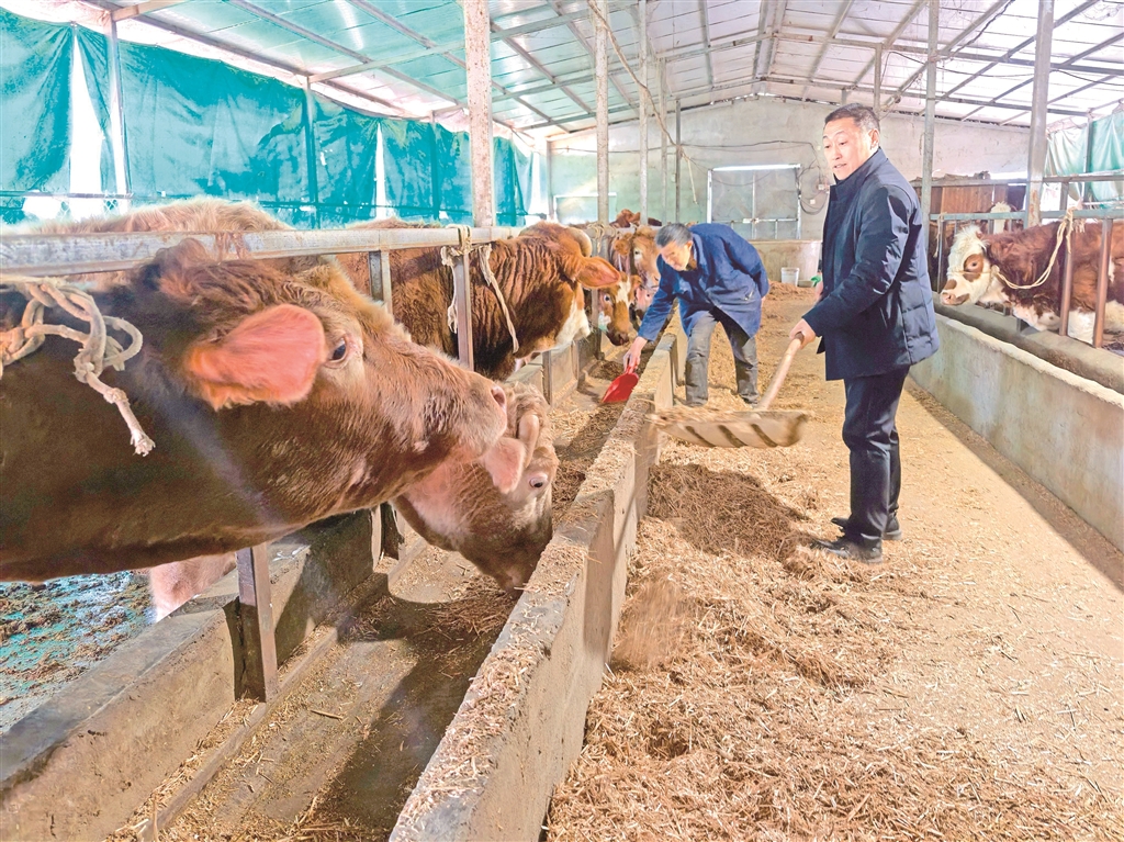 近年来,岚皋县四季镇竹园村村民史兴军投资100余万元,从延安市引进西门塔尔肉牛进行养殖。图为1月20日,史兴军正在给肉牛添加饲料。