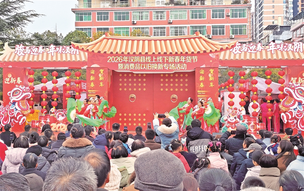 1月30日,汉阴县举行2026年线上线下新春年货节暨消费品以旧换新专场活动,吸引了70余家参展商参加。活动现场,游客们欣赏文艺演出、品尝美食、采购年货,让冬日里的县城变成了欢乐的海洋。