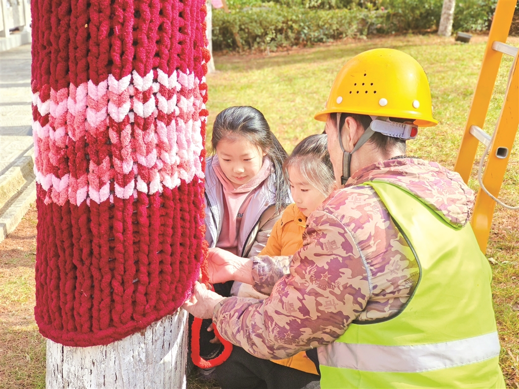 1月27日,宁陕县全面启动春节氛围营造工程,一盏盏彩灯、一个个灯笼、一组组景观,将县城装扮得焕然一新。图为工作人员正为县城重点路段旁的行道树穿上“彩色毛衣”,新颖的装饰令人眼前一亮。