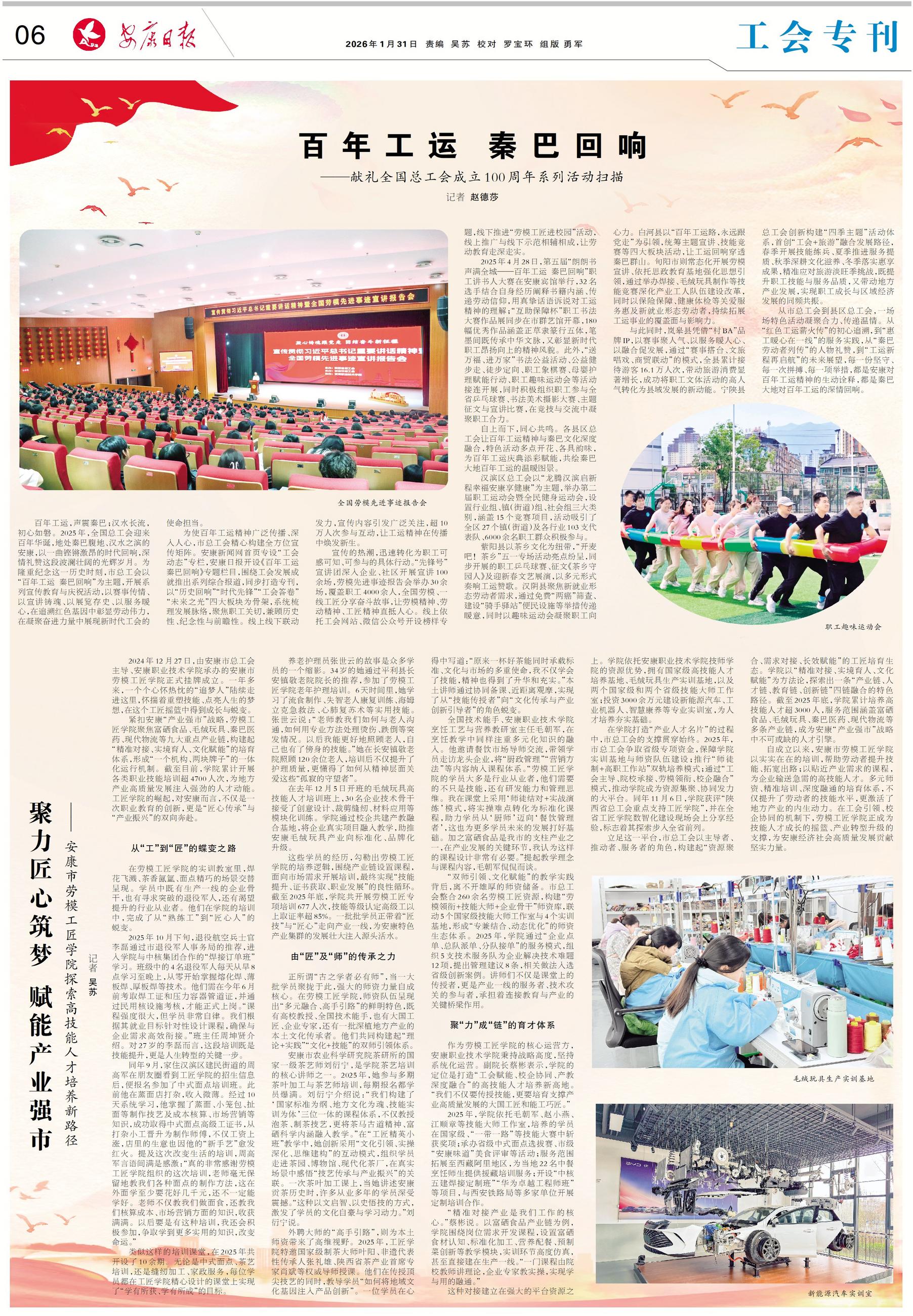 在学院打造“产业人才名片”的过程中,市总工会的支撑贯穿始终。2025年,市总工会争取省级专项资金,保障学院实训基地与师资队伍建设;推行“师徒制+高职工作站”双轨培养模式;通过“工会主导、院校承接、劳模领衔、校企融合”模式,推动学院成为资源集聚、协同发力的大平台。同年11月6日,学院获评“陕西省总工会重点支持工匠学院”,并在全省工匠学院数智化建设现场会上分享经验,标志着其探索步入全省前列。