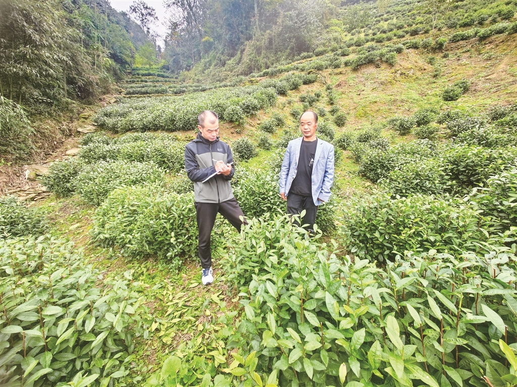 朱晶(左一)在茶园了解产业发展情况