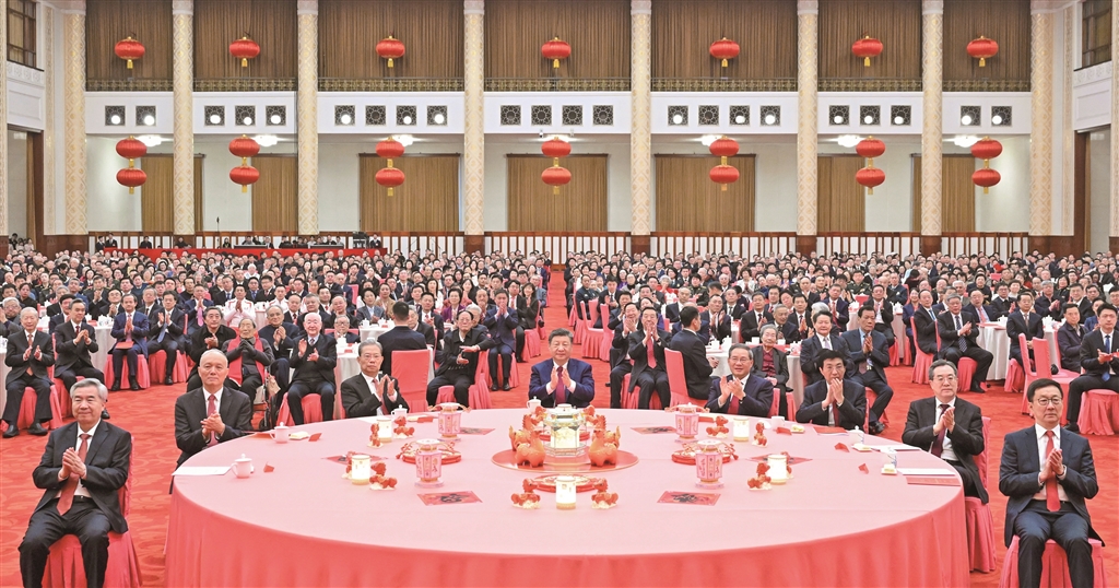 人民大会堂宴会厅灯光璀璨、喜气洋洋,各界人士2000多人欢聚一堂、共迎佳节,现场洋溢着欢乐祥和的节日气氛。