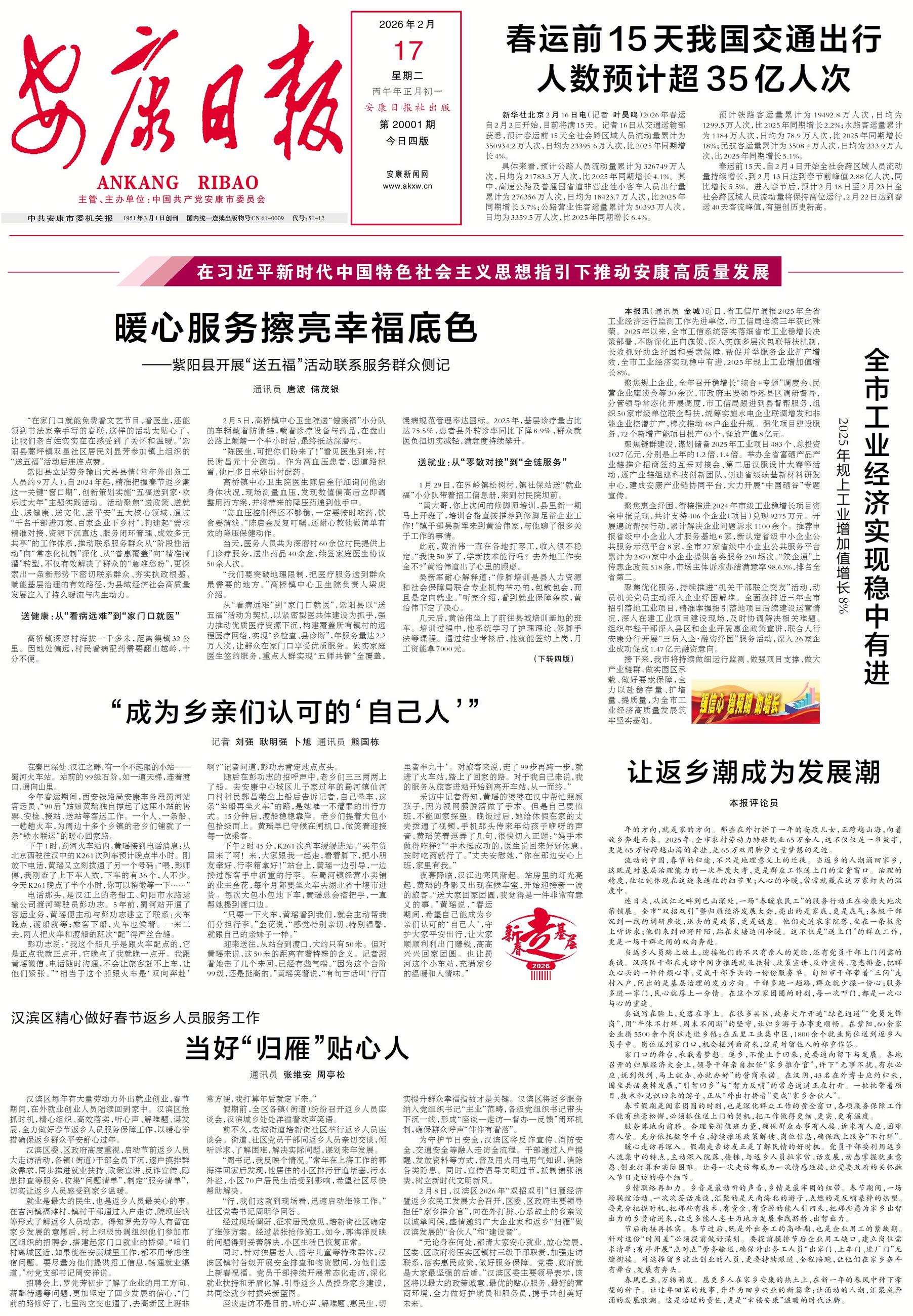 当返乡人员踏上故土,迎接他们的不只有亲人的笑脸,还有党员干部上门问需的真诚。汉滨区干部在走访中同步推进就业扶持、政策宣讲、反诈宣传、隐患排查,把群众心头的一件件烦心事,变成干部手头的一份份服务单。旬阳市干部带着“三问”走村入户,问出的是基层治理的发力方向。干部多跑一趟路,群众就少操一份心;服务多进一家门,民心就厚上一分情。在这个万家团圆的时刻,每一次叩门,都是一次心与心的重逢。