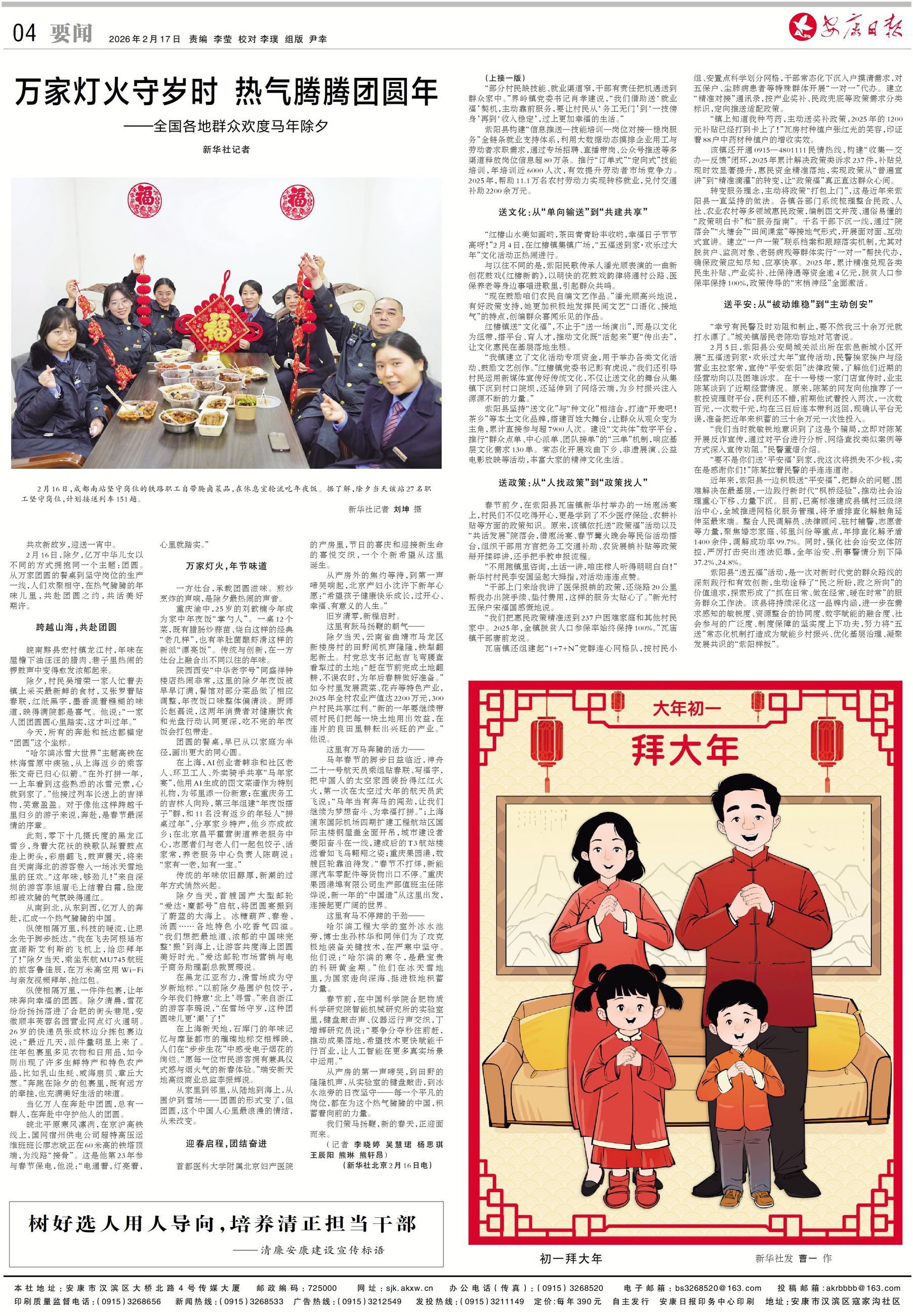 2月16日,除夕,亿万中华儿女以不同的方式拥抱同一个主题:团圆。从万家团圆的餐桌到坚守岗位的生产一线,人们欢聚相守,在热气腾腾的年味儿里,共赴团圆之约,共话美好期许。