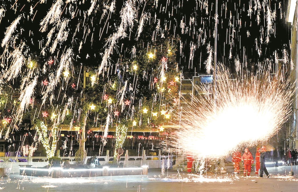 2月18日晚,宁陕县政府广场举办民俗文化活动。图为“打铁花”表演。