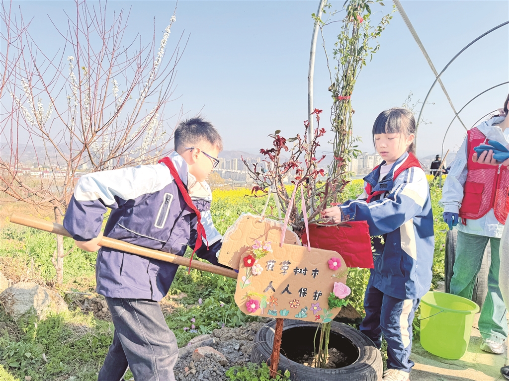 3月11日,汉阴县城关镇新城社区、南街社区联合凤台小学、中堰村,开展“党建引领添新绿 实干担当促发展”植树节主题党日活动。活动现场,党员志愿者、师生代表分工协作、干劲十足,挖坑扶苗、培土浇水,以实际行动为家乡增添绿意。大家还精心制作了环保寄语卡片,悬挂在新栽种的树苗上,传递绿色发展理念。