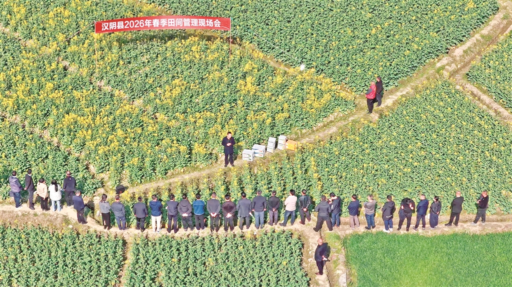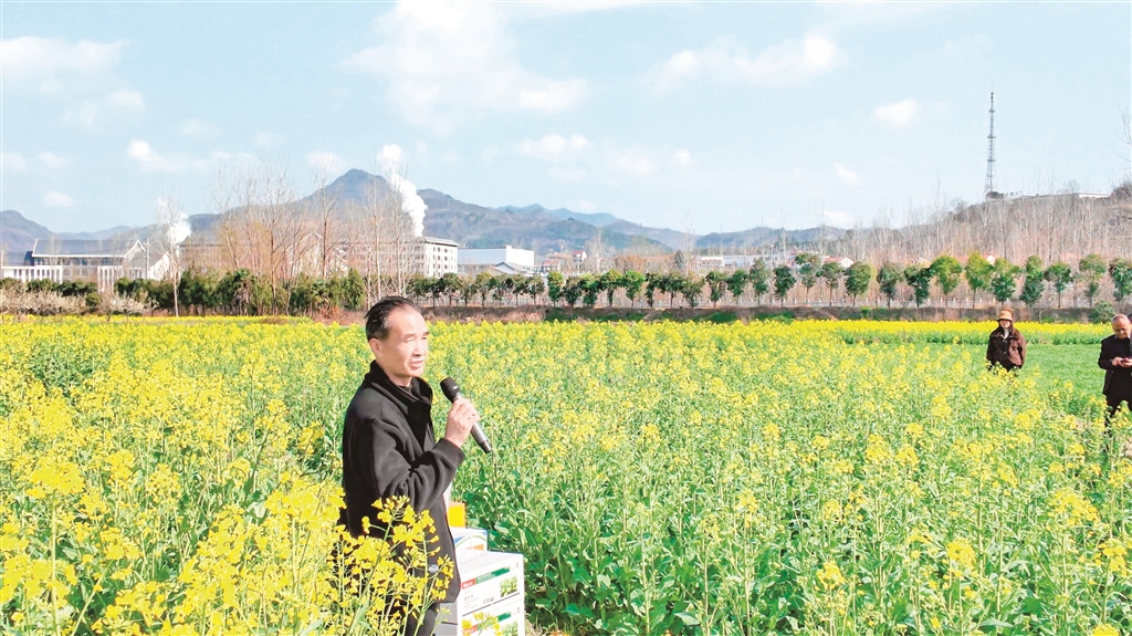 汉阴县各镇农业工作负责人、新型经营主体及种植大户代表在城关镇草桥村油菜种植基地观摩学习油菜“一促四防”关键技术。