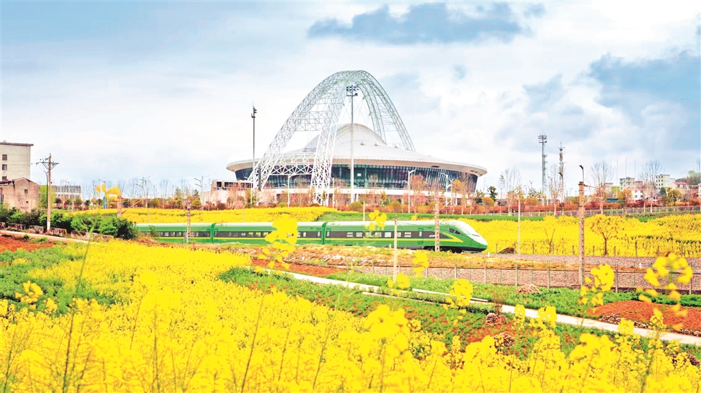 3月16日,安康市体育馆前,金黄的油菜花海与飞驰的复兴号列车相映成趣,尽显春日生机。
