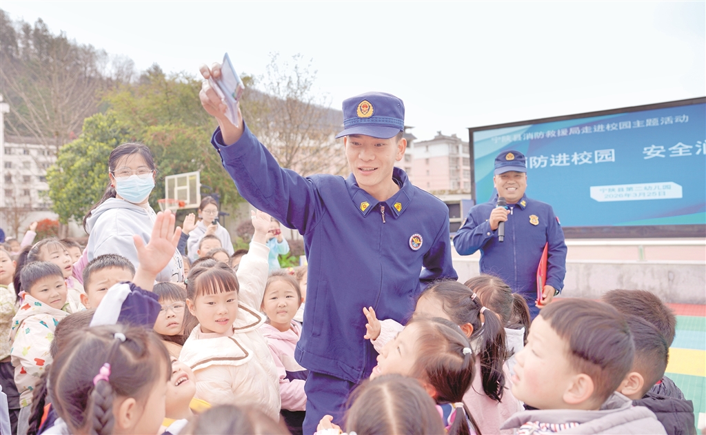 宁陕县消防救援局消防队员正在为学生进行消防知识问答。 杨稳 摄