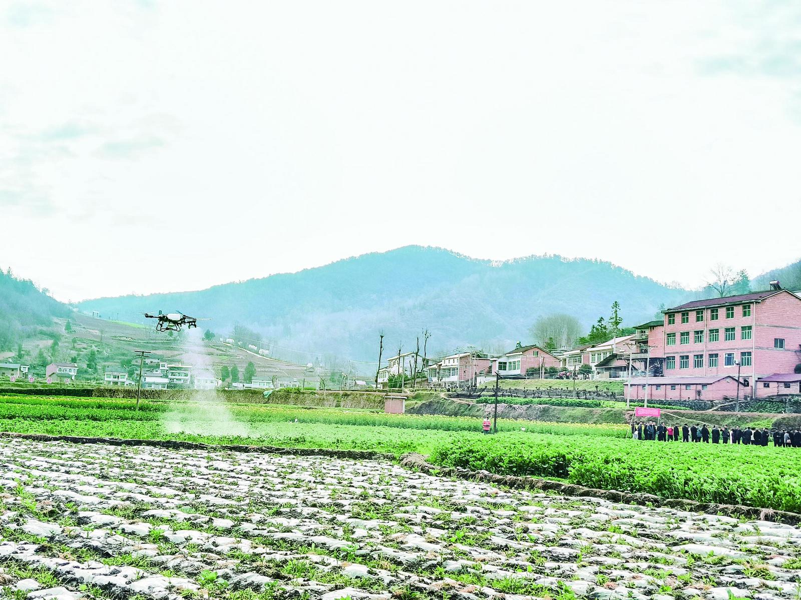 3月12日,石泉县中池镇开展第三十四届“科技之春”宣传月系列活动。图为植保无人机飞防作业演示。