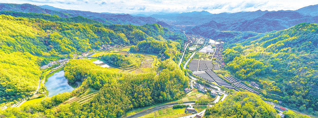 近日,石泉县城关镇草池湾朱鹮小村色彩斑斓,湖光山色美不胜收。