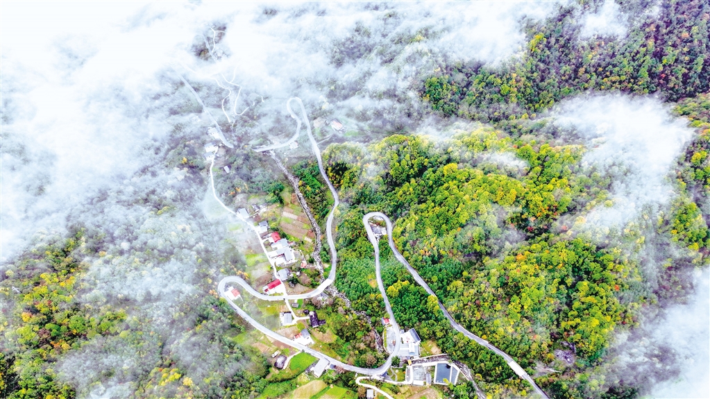 初冬,从高空俯瞰化龙山国家级自然保护区,层林尽染,景色宜人。