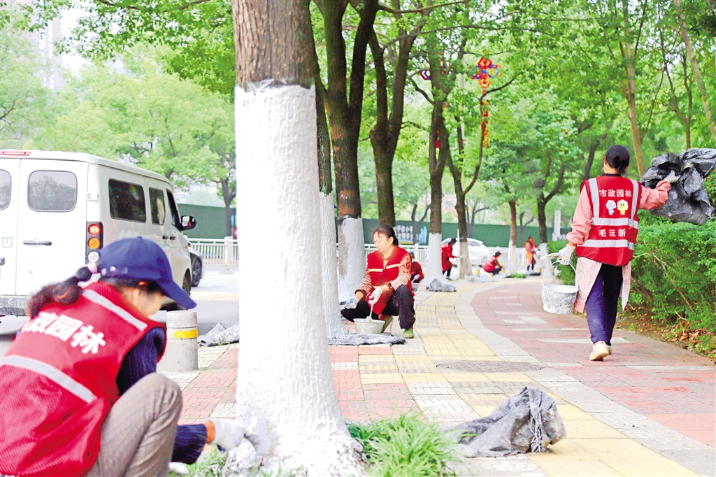 本报讯(通讯员 钱运立 李敏)11月5日,安康城区滨江大道、东内环路、黄沟路、东坝泵站等路段一派忙碌景象,绿化工人们或站或蹲,手持刷子、滚轮在树干上往复涂刷,桶中特制涂白剂随着动作均匀附着在枝干上。转瞬之间,道路两旁的行道树便穿上了整齐划一的“白裤子”,成为秋日里一道兼具实用与美感的城市风景。