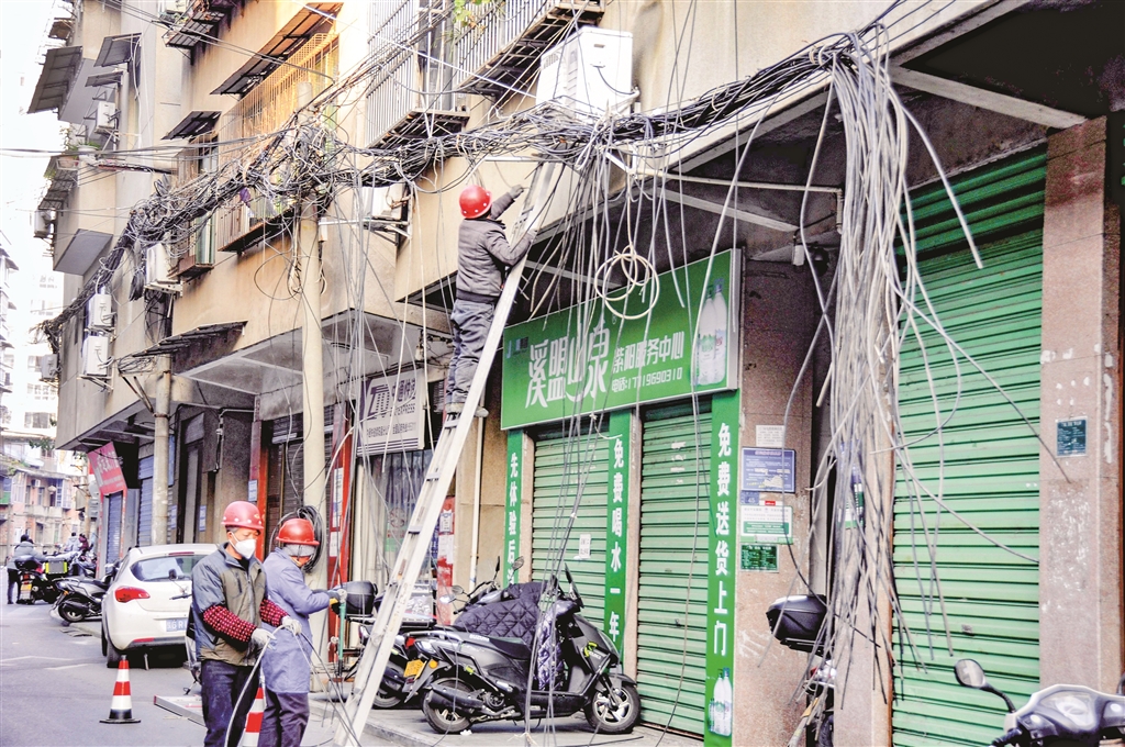 2025年下半年以来,紫阳县持续推进县城河堤路、紫府路和环城路等重点路段的弱电入地工作。图为1月22日,工人正在拆除环城路老旧电线路设施。