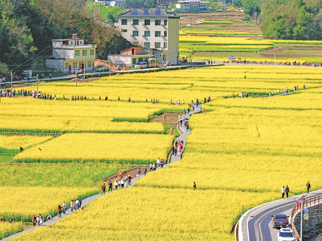 连日来,旬阳市仁河口镇水泉坪3A级景区的近千亩油菜花竞相绽放,金黄色的花海铺展如画,吸引了众多游客前来踏青赏花。